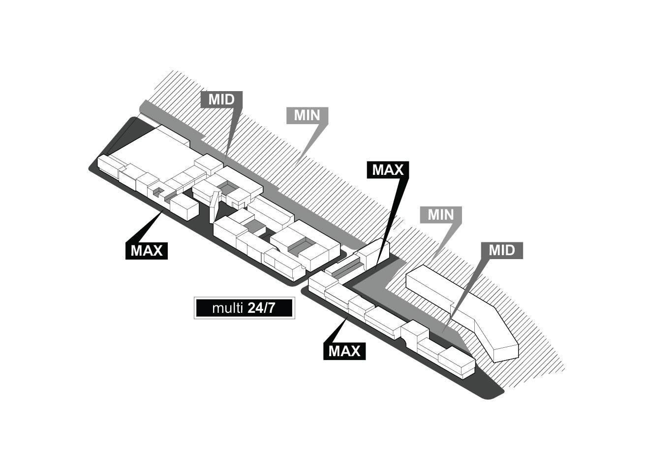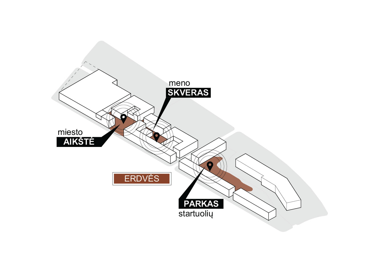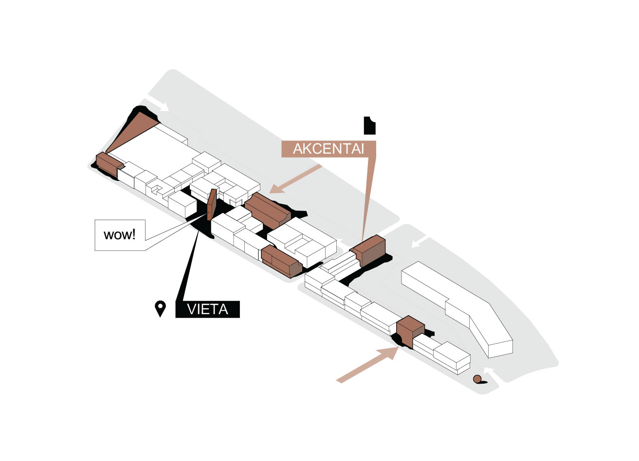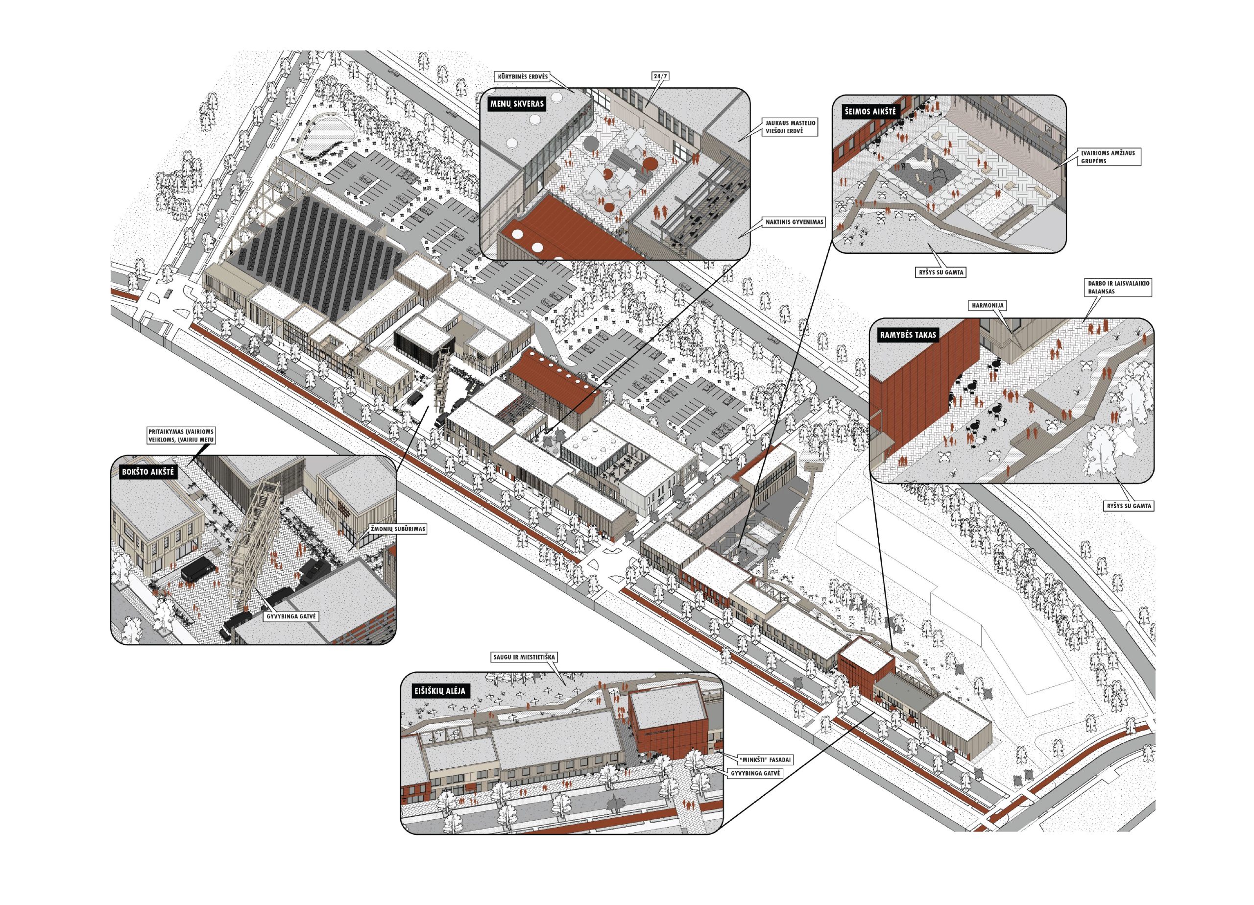 The functions of the internal and public spaces form the concept of a 24/7 vibrant district