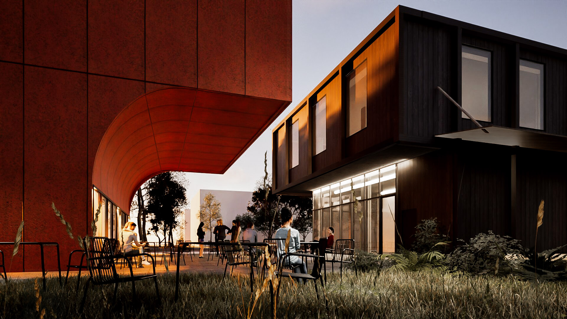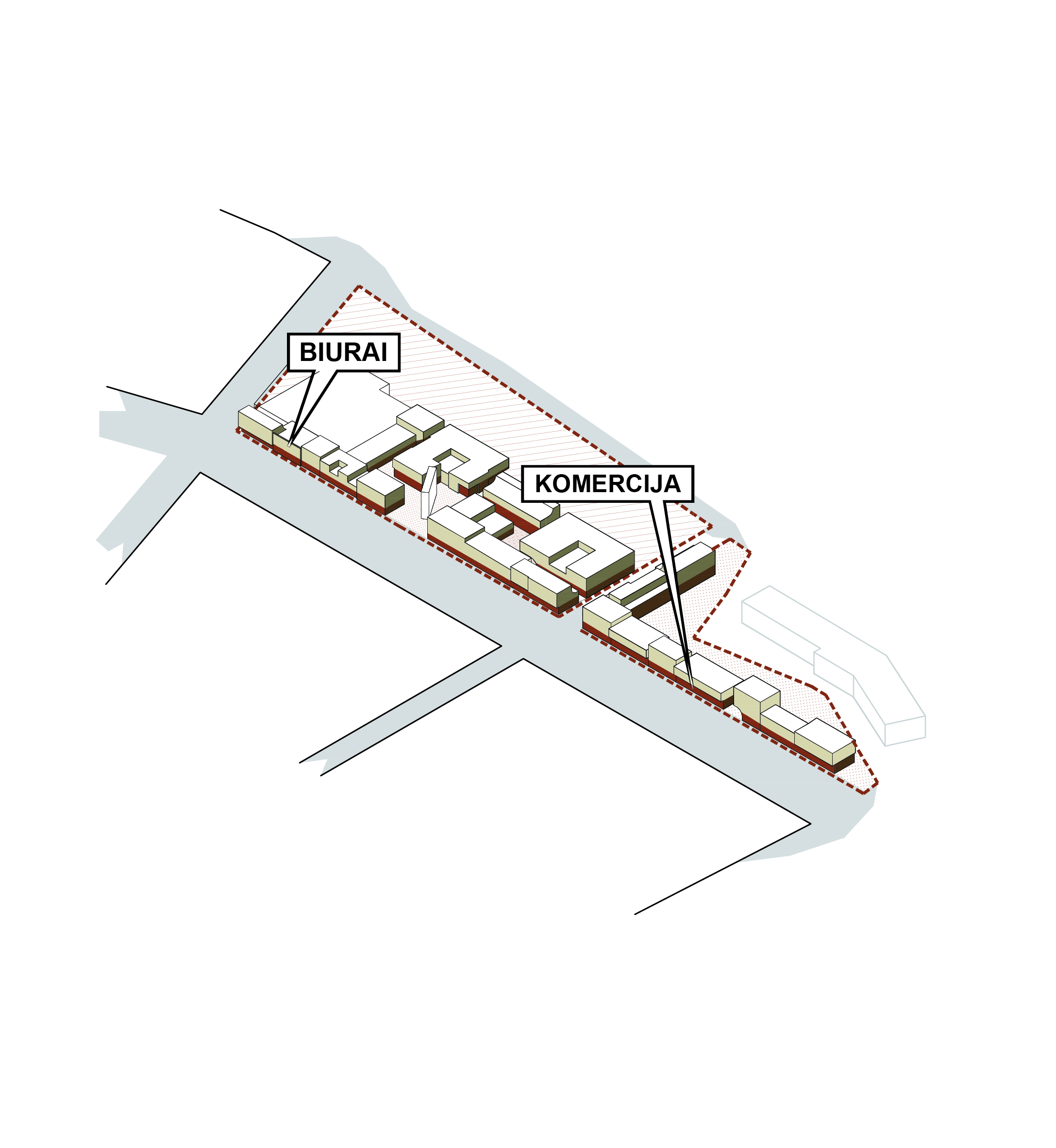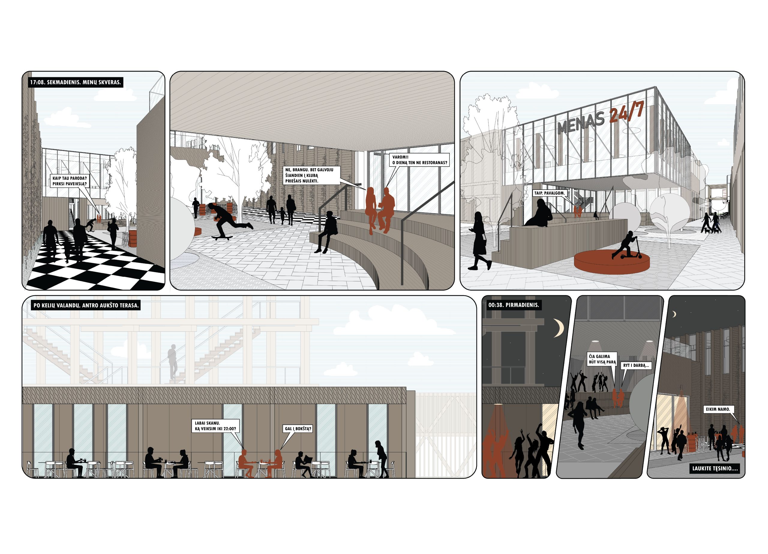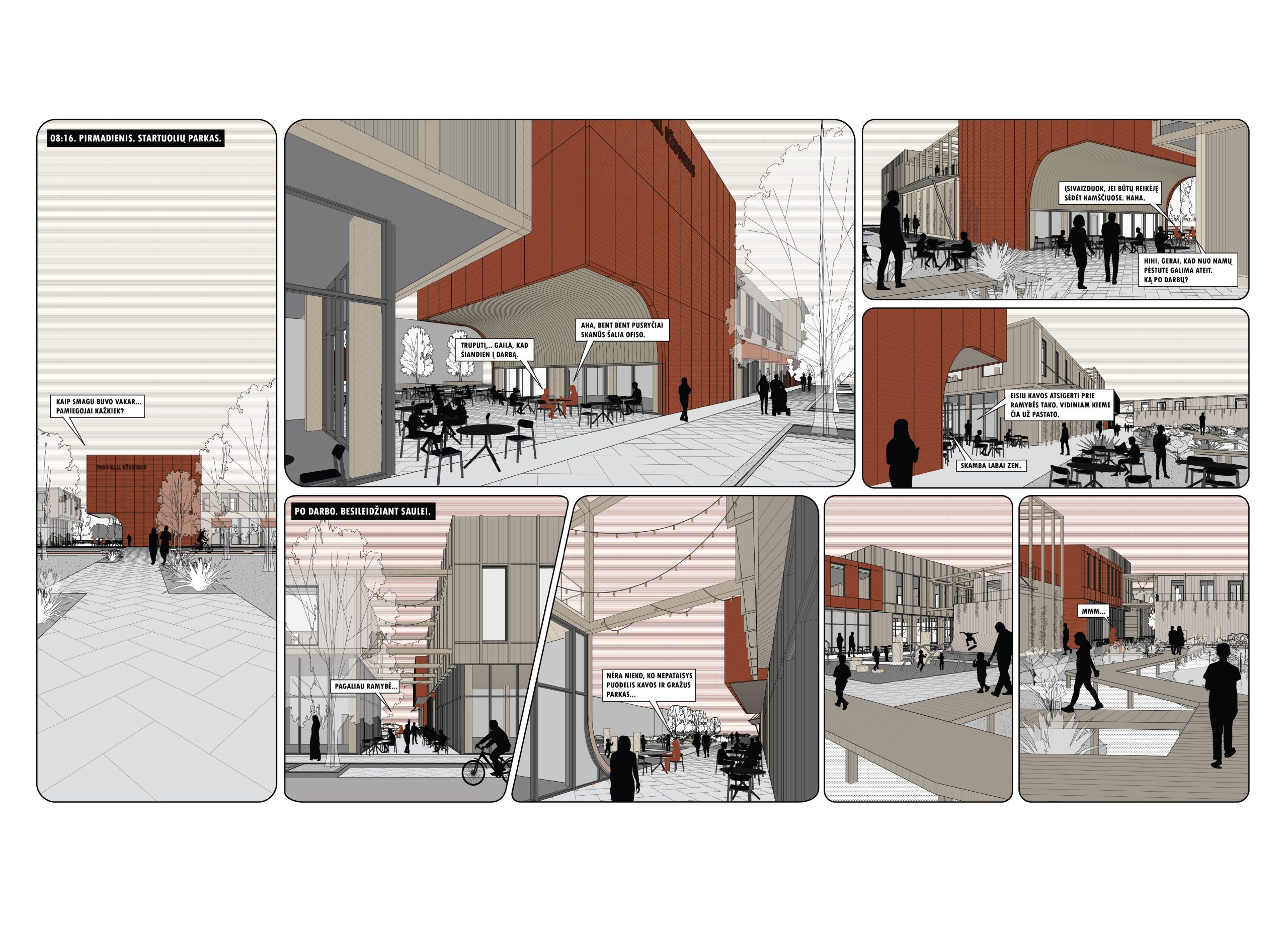 The functions of the internal and public spaces form the concept of a 24/7 vibrant district