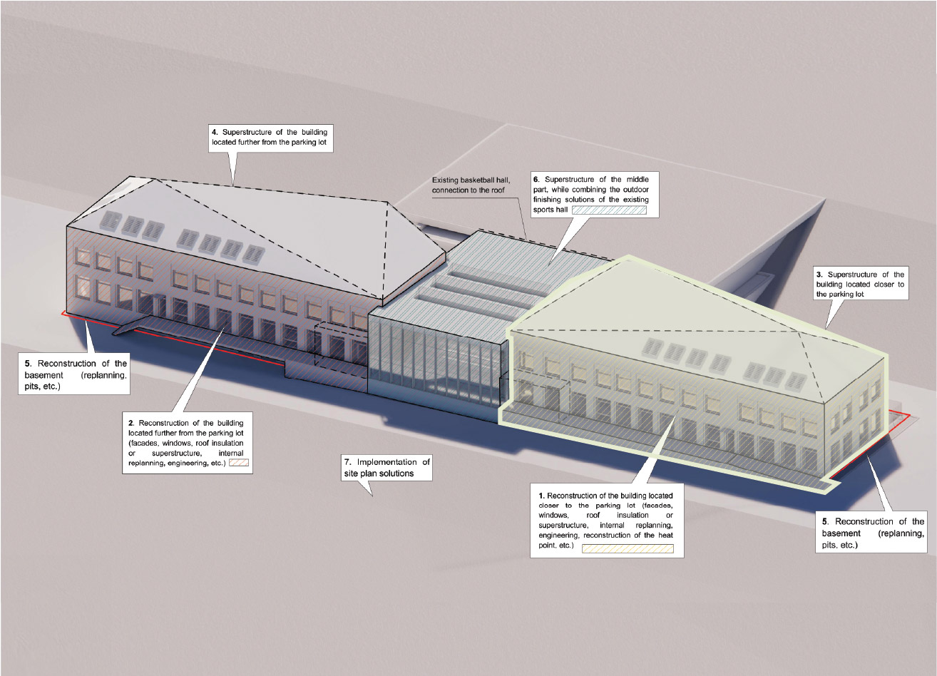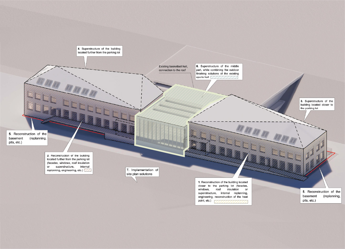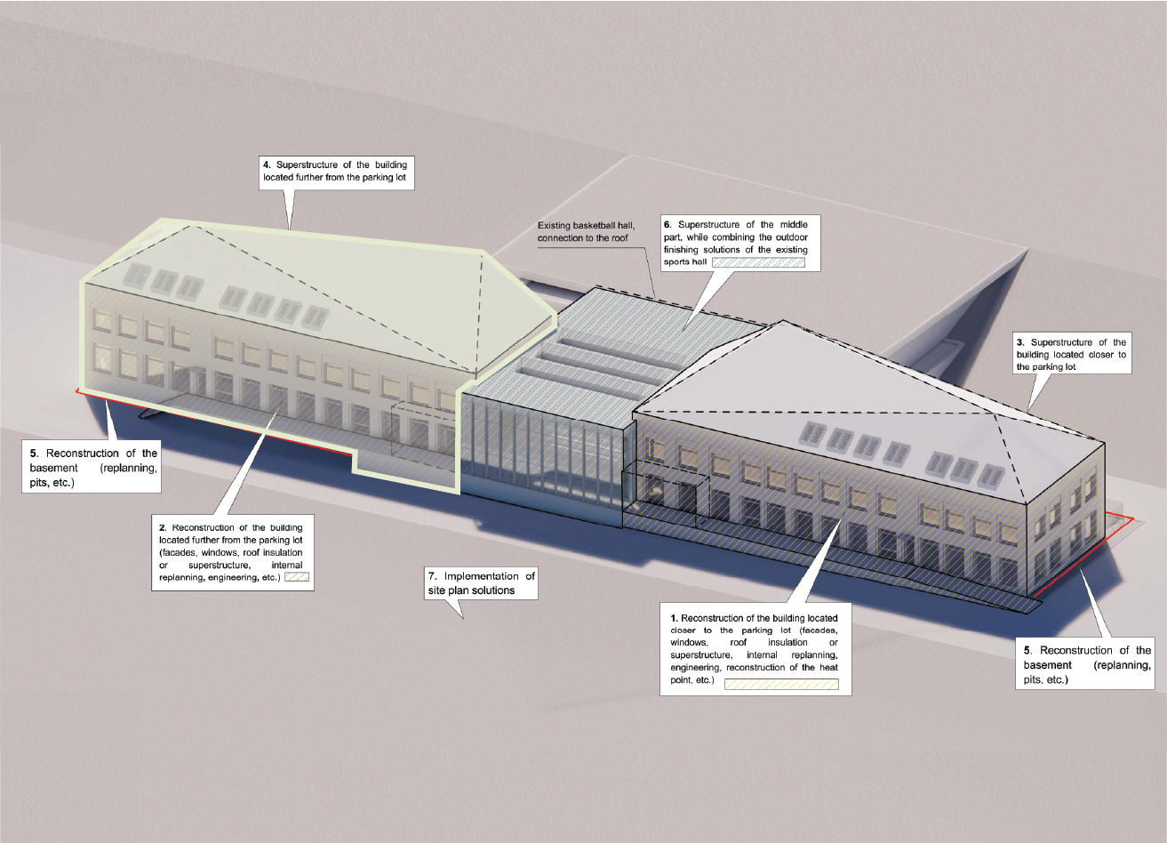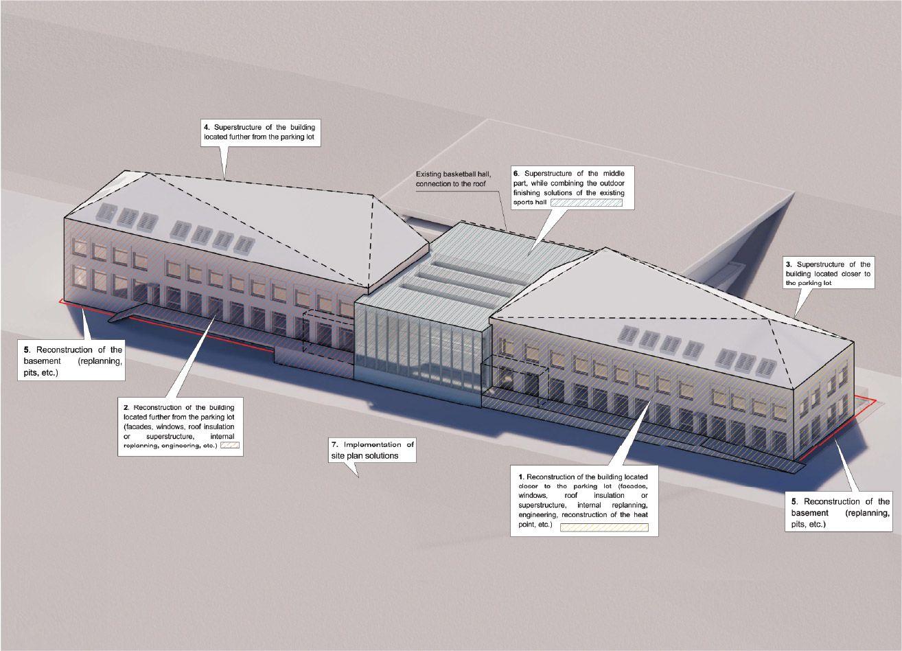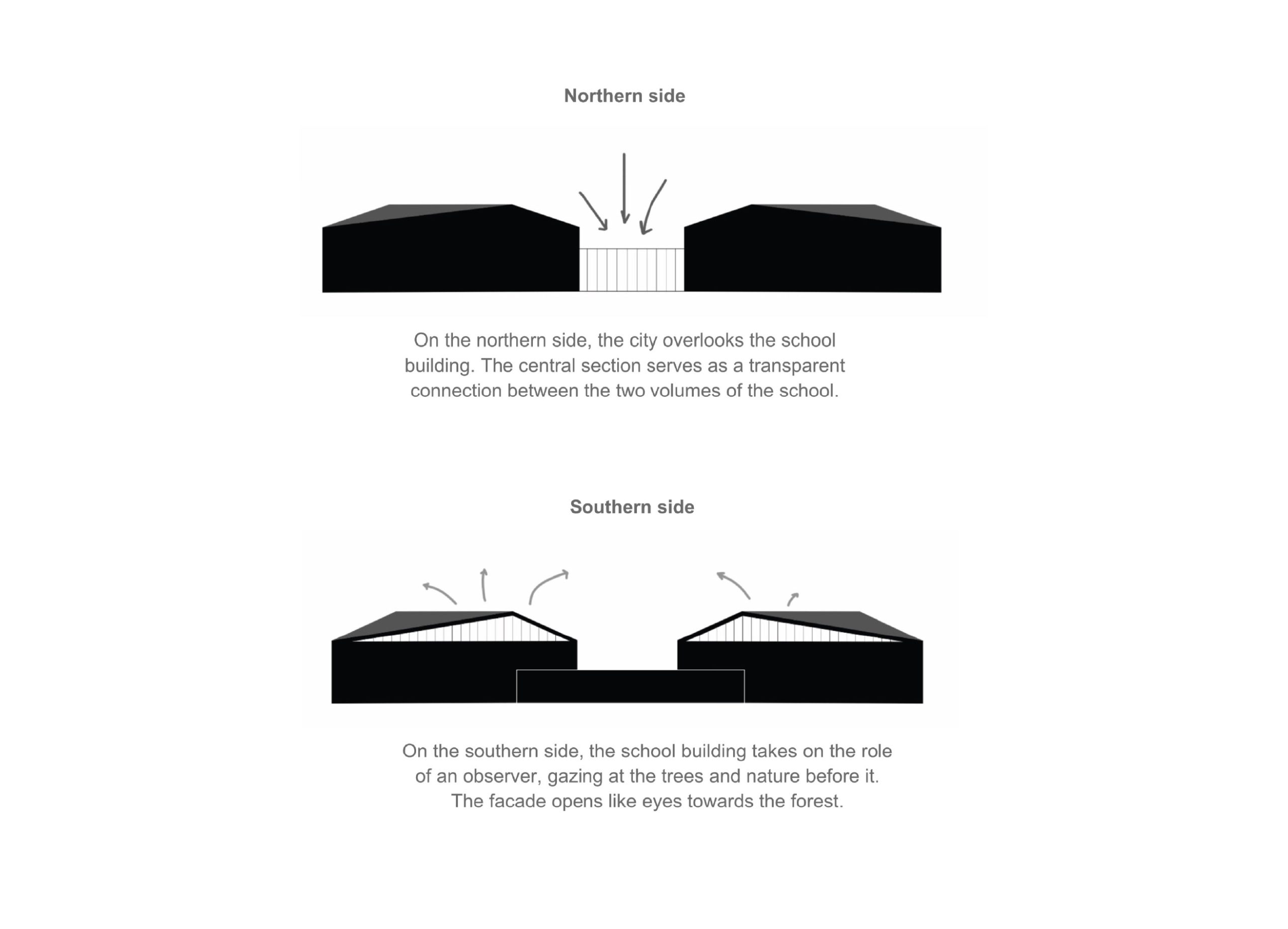 The new design merges multiple volumes into a single composition through a central axis — a multifunctional hall and atrium that become the school’s social and spatial heart. This core connects classrooms, administrative areas, and shared learning spaces, ensuring fluid circulation and interaction. The roofline interprets traditional pitched forms in a contemporary language: broken geometries and varied slopes blend harmoniously with the surrounding urban fabric while expressing modernity and lightness.