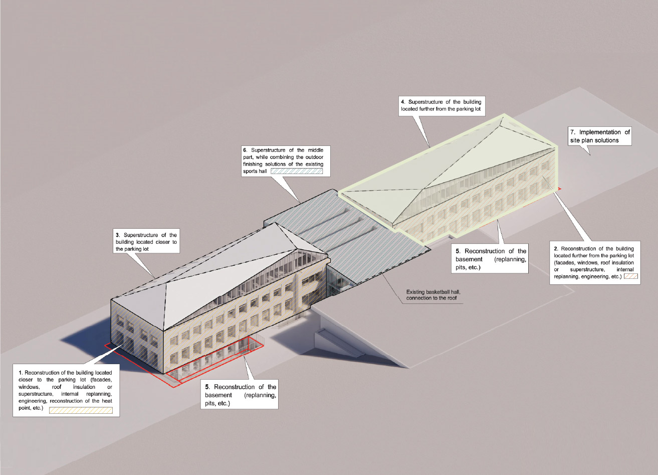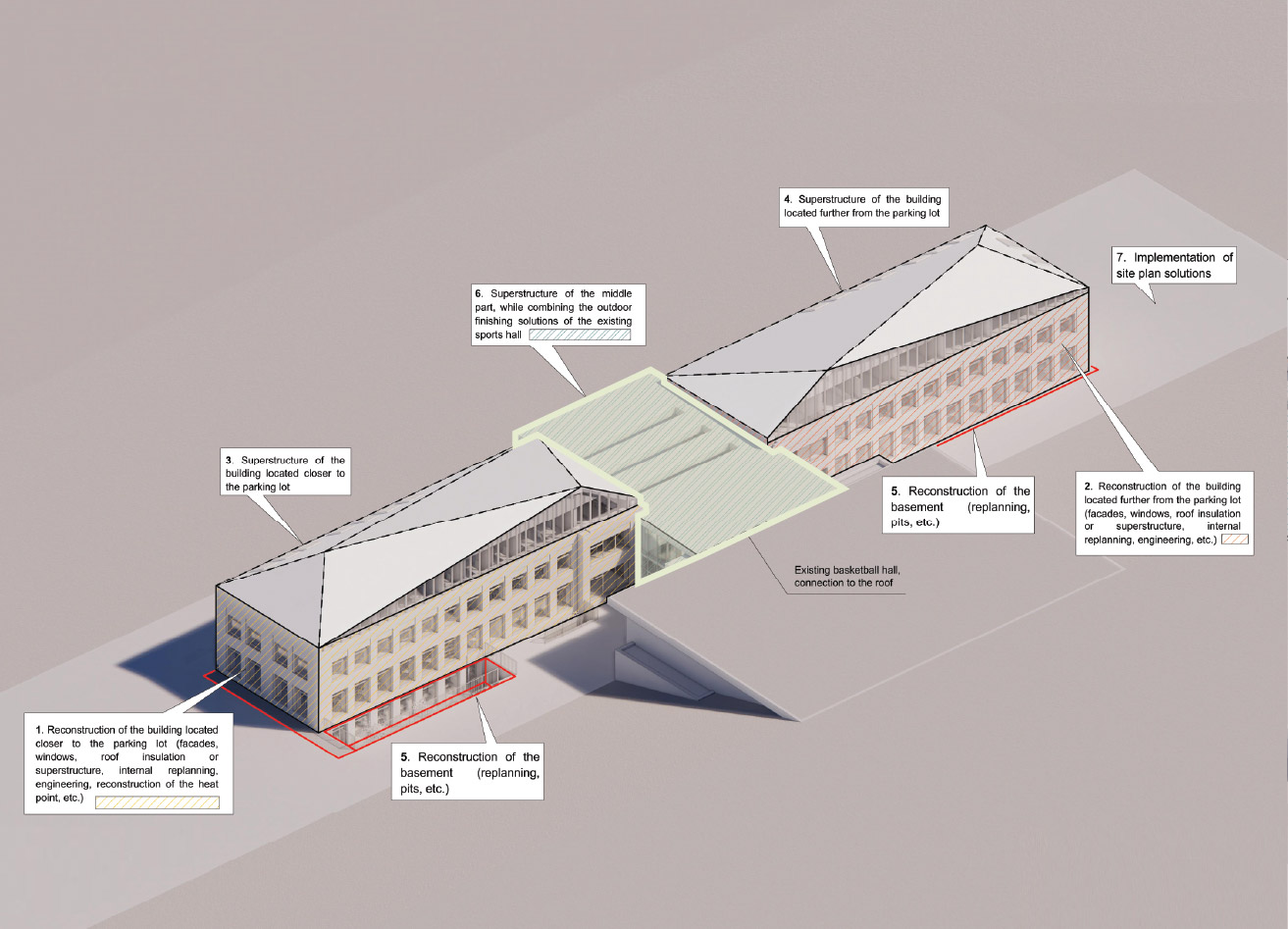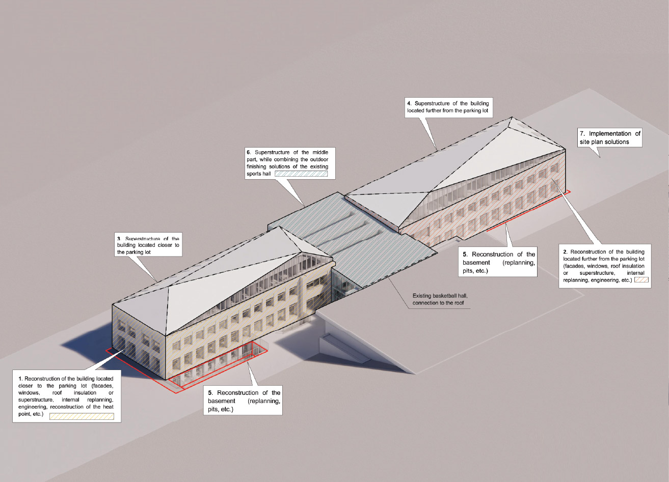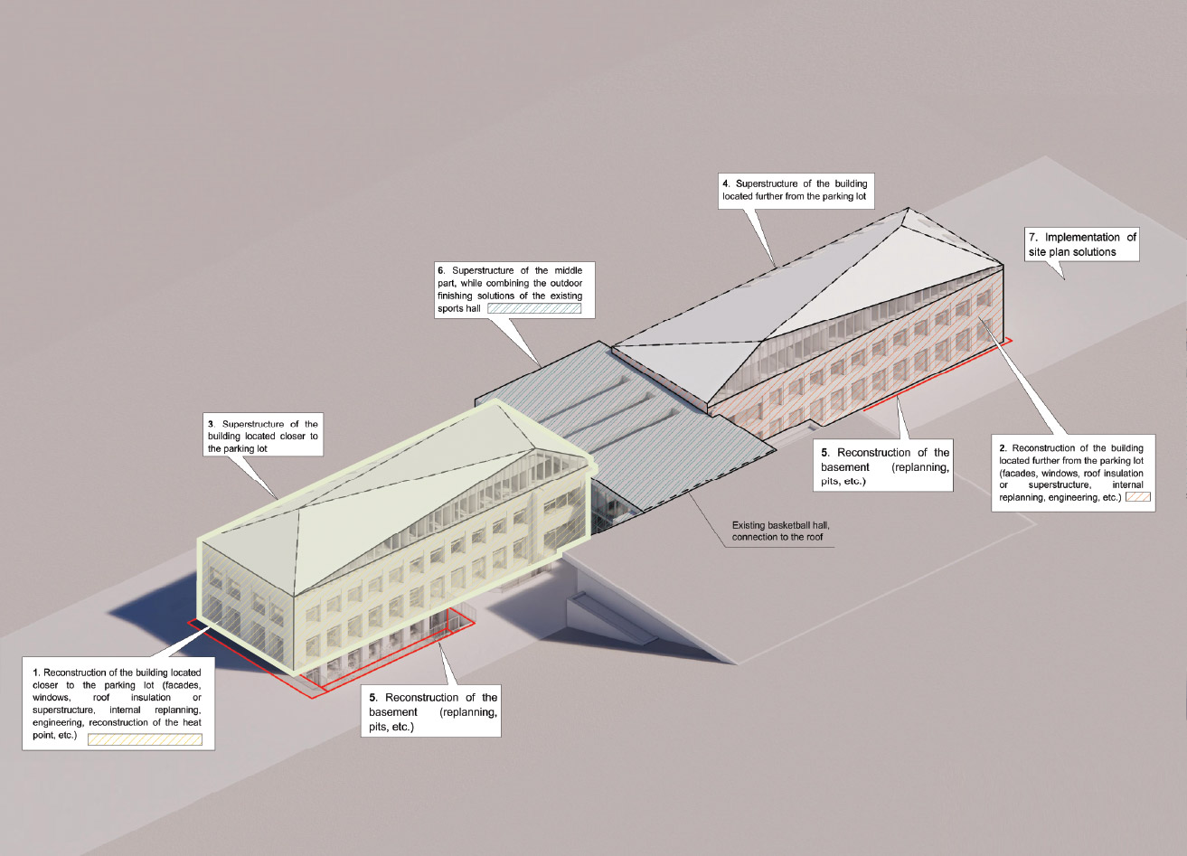 Architecturally, the project establishes a dialogue between past and future — preserving existing structures while reimagining them through new forms, materials, and connections. The result is a vibrant, open, and inclusive learning environment that reflects the international character of the school and the evolving educational landscape in Vilnius.